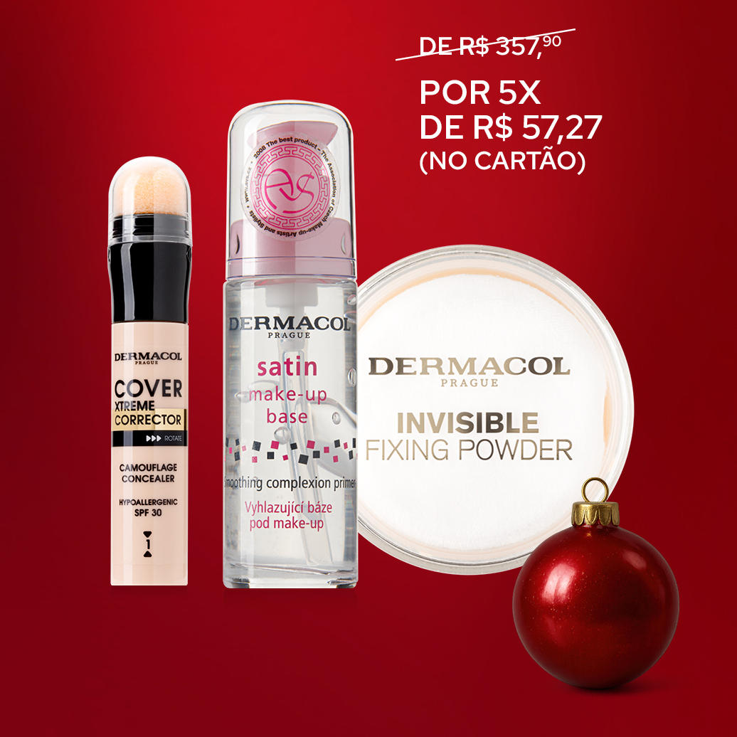 Kit pele Perfeita Xtreme: os poderes do primer Satin, do corretivo de alta cobertura Cover Xtreme Corrector e do pó Invisible Fixing Powder unidos por sua beleza